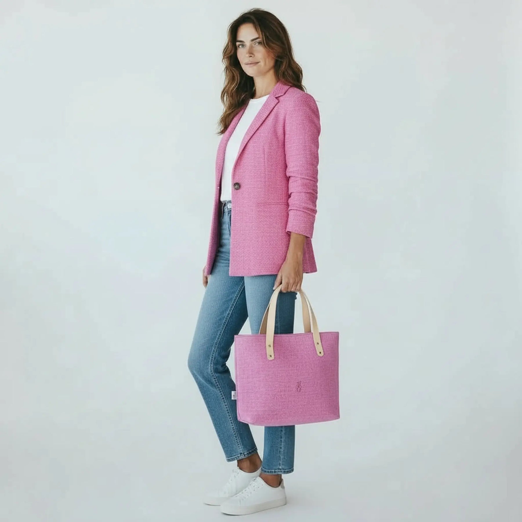 Woman standing in a white studio wearing jeans and a pink blazer, holding a large pink Harris Tweed® tote bag by her side